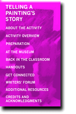 PreparationTake note of the locations of paintings that will lend themselves well to the activity, i.e., realistic works portraying at least one human figure. Such paintings will facilitate a student's sense of connection to the work and will provide plenty of visual stimulus to pique students' imaginations. (Before going to the museum, you may want to model the activity in class so the students will know what to expect. One way to do this is to buy reproductions of paintings, in the form of slides or postcards, from the museum. Bring them into the classroom a day or two before your trip to the museum and have the students complete steps 2 through 5 under At the Museum.)