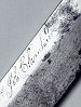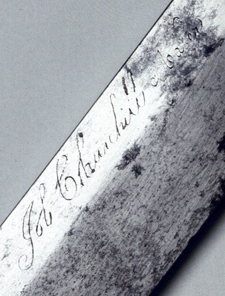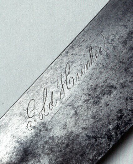 Job Churchill, the “maker” of this Bowie knife, left us no other record of himself, but the knife tells us a great deal. The handle is a piece of scrimshaw, a carving from whale ivory. Job, then, was probably a sailor on a whaling ship. The inscription GOLD HUNTER fixes the object in time. When Job etched these words, he was hoping to find his fortune by joining the California Gold Rush. Perhaps he was planning to jump ship at the port of San Francisco.