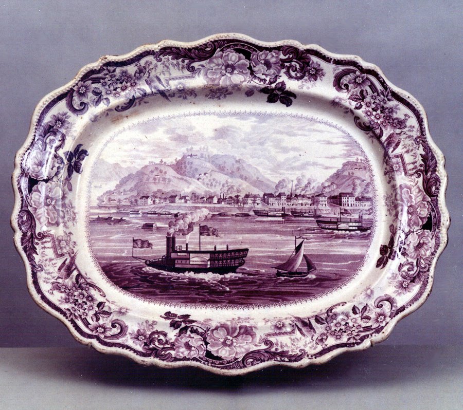 Not long after the War of 1812, when trade between Britain and the United States resumed, pottery factories in Staffordshire, England, began to design lines of tableware especially for the American market. The pieces were decorated with American imagery: historical scenes, portraits of heroes like Washington and Lafayette, and picturesque views of notable places. On this Staffordshire platter, produced in the 1830s, the steamboat The Pennsylvanian dominates a view of Pittsburgh.