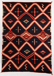 Design: "Moki" pattern sarape with a very narrow, alternating blue and brown stripe background. A row of concentric diamonds in solid and broken striped terraced lines extends across the center. To either side, a web of open, terraced diamonds is developed, framing polychrome lightning, cross, and terraced diamond designs.